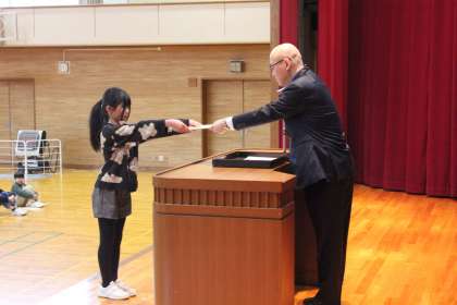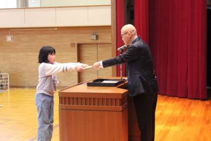 修了式を迎えました。代表の子供が、校長先生から修了証を受け取りました。