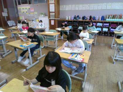 読み聞かせしていただいたあと、自分たちでも本を選びました。先日道徳の時間に話し合った「友だち屋」シリーズを選んだり、母の日に合わせて関連した本に司書の先生がカーネーションをつけてくださっていて、その本を選んだりしていました。そして、どの子供たちも、教室に戻って、じっくりと本を読んでいました。これからもどんどん読書してほしいものですね。