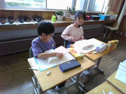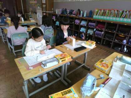 今日は国語辞典の使い方の学習をしました。二人ペアで競争しながら、使い方に慣れていっています。