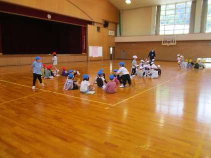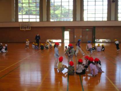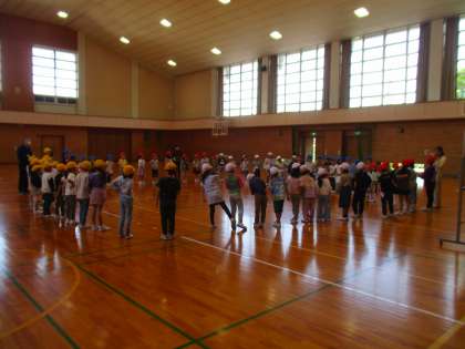 その後に、お楽しみゲームタイムがありました。グループごとに「ハンカチ落とし」をしたり、全体で「拍手リレー」をしたりして楽しみました。