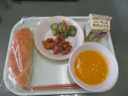 今日は、ひよこ豆のお話をしました。給食では、よく登場します。ひよこの形に似ているので、「ひよこ豆」と名前が付いたそうです。別名「ガルバンゾー」とも言います。6年生さんは、「ガルバンゾー食べて運動会頑張るぞ」と言っていました。今日もおいしくいただきました。