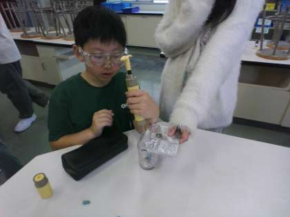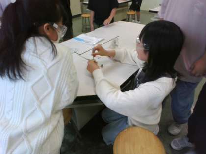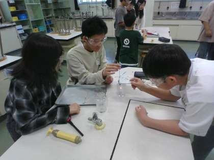 1時間目は気体検知管や石灰水を使って、物が燃える前と燃えた後の気体を調べました。安全に気を付けながら協力して実験を行いました。