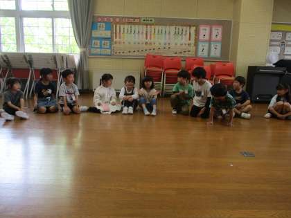 今日は、「たん・たん・たん」のリズムに合わせて拍を打ったり、友達の名前を呼び合ったりしました。