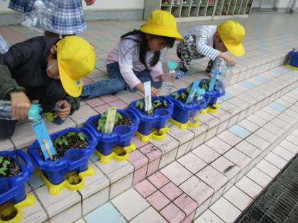 「昨日よりも、大きくなっている」「葉っぱが2枚だったのが、増えている」「くきが太くなった」と昨日との違いを見付けています。