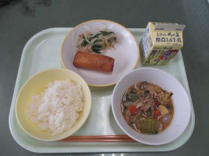 今日は、八宝菜のお話をしました。八宝菜の「八」は、8種類の具材という意味ではなく、「たくさんの」という意味、「菜」は「おかず」という意味があるそうです。給食では、9種類の食材が入っていました。全部分かりましたか?今日もおいしくいただきました。
