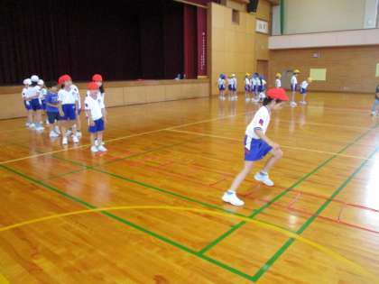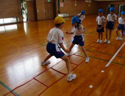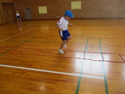 体育なんでも係からの挑戦状で、ラダーをしました。今日の挑戦は、左右に細かく足を動かしながら自分なりに早くラダーができるようになることでした。その後、ケンケンやグーパー等でラダーしました。最後は、色別でじゃんけん勝負でラダーを競い、楽しみました。
