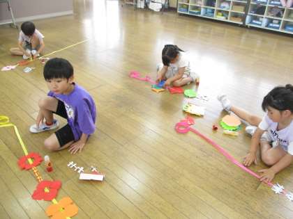 今日は、切ったものを長くつなげて、作品を仕上げる活動をしました。