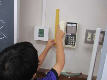 算数科の長さの学習では、教室にあるものの長さを調べました。身近なものの長さを測ると思ったより大きかったり、小さかったり。また、ちょうど「○cm」ときりのいい長さを見つけるなど、楽しく正確に長さを測っていました。