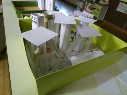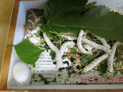 この週末の間に蚕が繭を作り始めました!!今日で孵化してから34日目です。今までもりもり、もりもり、桑の葉を食べていましたが、ついに繭を作る蚕が登場してきました!もうだいぶ大きくなった蚕でも、まだまだボリボリと桑の葉を食べているものもいます。早くみんな繭になって欲しいものですね!