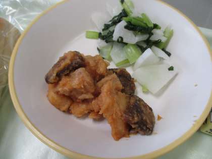 今日は、レバーのお話をしました。レバーは、苦手な人も多いですが、今日の味付けは、すりおろしりんごと砂糖、酢、しょうゆを合わせた、甘酸っぱいソースだったので、「おいしい」と言う声をたくさん聞きました。栄養たっぷりのレバーを、おいしくいただきました。