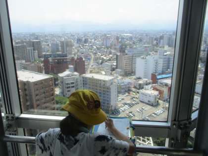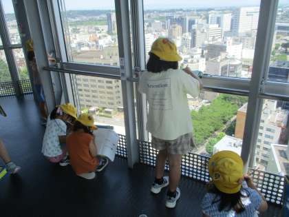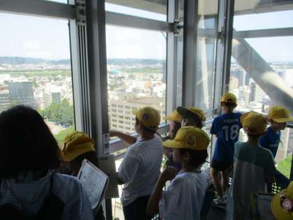 富山市役所展望塔から富山市の様子を観察しました。「ビルがたくさんあるな」「あの大きな建物は何だろう」「あそこに新幹線が走っているのか」「八尾の周りより車の量が多いな」など、新たな発見や、疑問、気付きがありました。