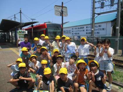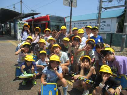 富山駅から岩瀬浜駅までは富山市内電車に乗りました。未来的デザインの『ポートラム』に子供たちは、興味津々でした。初めての子供も、乗ったことがある子供もワクワクしながら乗っていました。