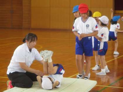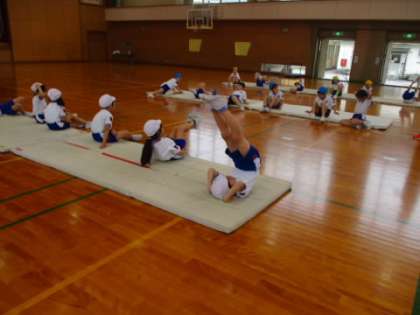 今日は、スポーツ指導員派遣事業として、富山市スポーツ協会のスポーツ指導員の方が来てくださって、マットの指導をしてくださいました。前転や後転をするときには、手をしっかりマットにつくことの大切さを教えていただきました。