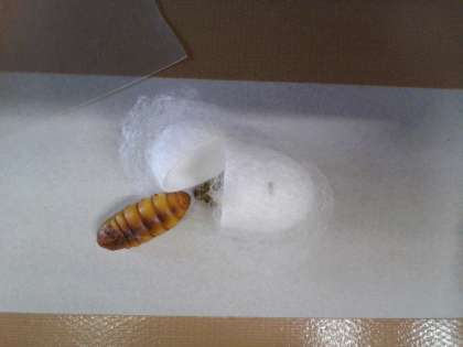 また、「繭の中はどうなっているの?」という疑問が出てきたので、教師用の繭を1つ切ってみました。すると中から茶色いさなぎがでてきました。「これはもう死んでいるの?」という声が出ましたが、「モンシロチョウと同じで、さなぎだから動かないだけで、そのうちに成虫になるんじゃないかな」と教えてくれる子供もいました。「でも、繭を切って大丈夫なのかな?」と心配してくれる子供も・・・。しばらく様子を見ていきたいです。