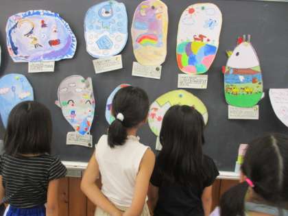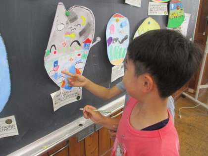 図画工作科の「ふしぎなたまご」の学習では、完成したたまごを鑑賞し、友達の作品のすてきやおもしろさを伝え合いました。卵の形のおもしろさや色使いのきれいさ等、たくさん友達のすてきやおもしろさを見付けていました。