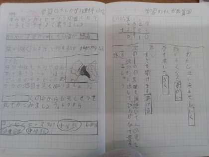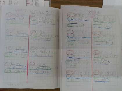 算数では、わり算の基本となる文章題を二つのパターンに分けて書いています。また赤・青・緑と色分けもしていますね。