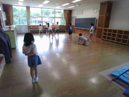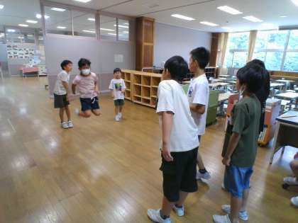 長縄8の字跳びをしたり、だるまさんが転んだをしています。