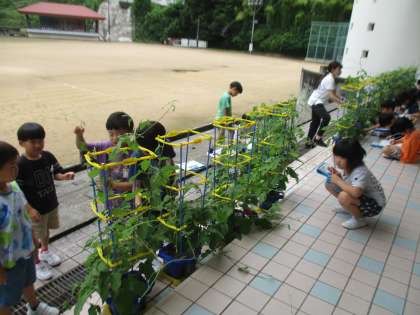生活科で育てているアサガオが大きく生長し、たくさんの花を咲かせるようになりました。「今日は○個、咲いてる!」「明日も咲くかな?」など、たくさんの子供たちが楽しみにしています。