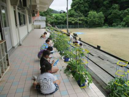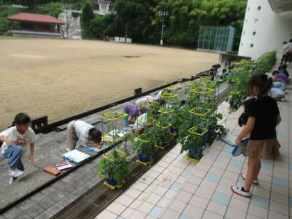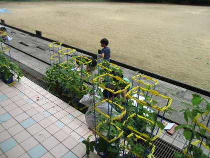 来週、個別懇談会がありますが、その機会にアサガオの鉢を、保護者の方にお持ち帰りいただきたいと思います。天候等に左右されると思いますが、懇談会当日でなくとも、夏休み前までにはお持ち帰りくださいますよう、お願い致します。