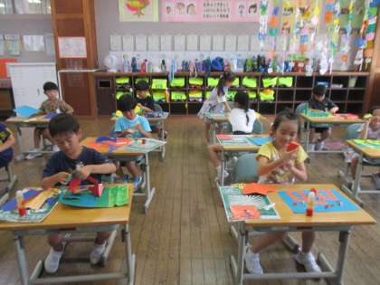 厚紙の上に、いろいろな形に切って折った形をのせて、自分だけの「まち」をつくりました。さまざまな想像のもと、いろいろな「まち」ができあがりました。