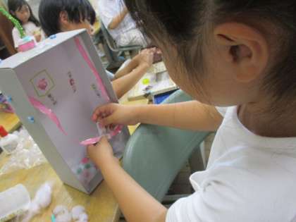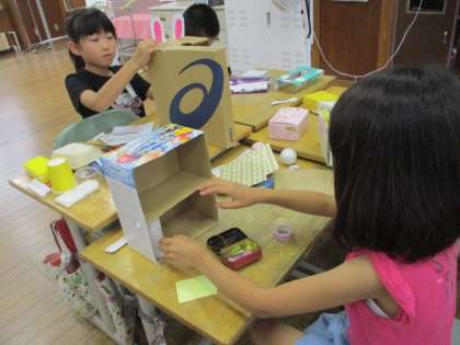 図画工作科の学習では、空き箱を使って、自分の友達が喜ぶ家を作りました。あったらいいなと思うものやおもしろいしかけがある家等、思い思いに想像を膨らませて作っていました。トイレットペーパーの芯、ビーズや折り紙、いろいろな材料で表していました。
