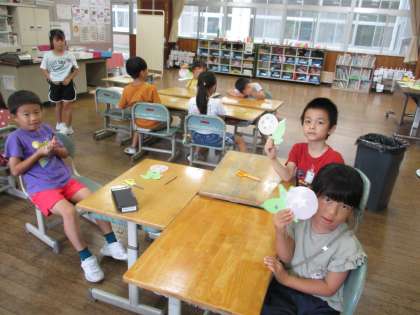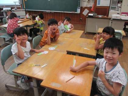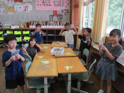 あさがおの色水で染めた紙と写した葉っぱを組み合わせて、しおり作りもしました。楽しい活動ができたのも、今日までお世話をがんばったからです。