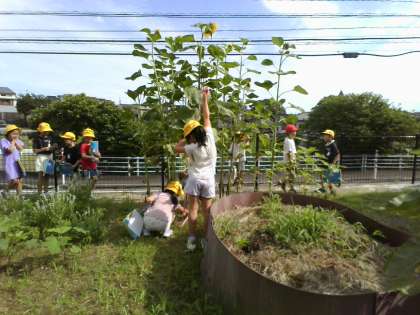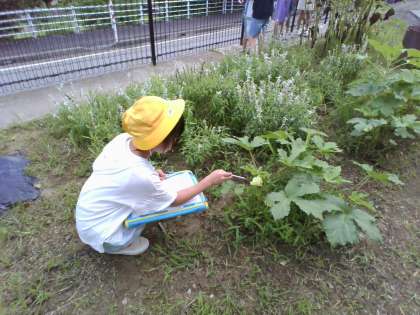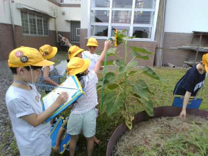 暑い日になってきました。朝のうちにホウセンカやヒマワリ、オクラの花の観察に行きました。ヒマワリは、みんなの背丈を優に超えていました。今までのジメジメとした雨と暑さのおかげて、植物は大きく成長していました。