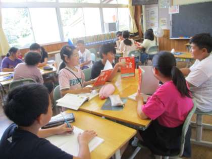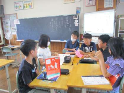 国語科の学習では、二つのチームに分かれて、説得力のある説明をする学習をしています。