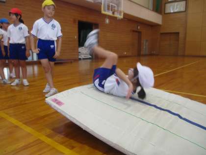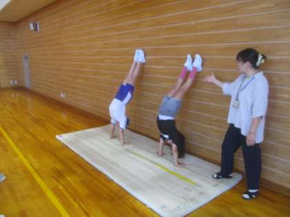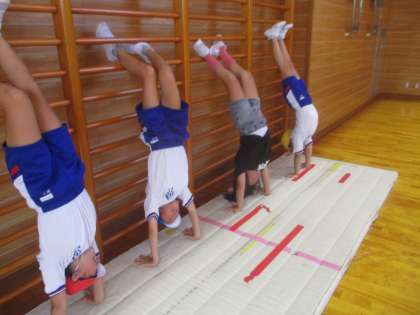 体育の学習でマット運動を行いました。1学期に外部講師を招いて学習したときのことを思い出しながら体を動かしました。前転や後転だけでなく、肋木を使った壁登り倒立や壁倒立も練習しました。