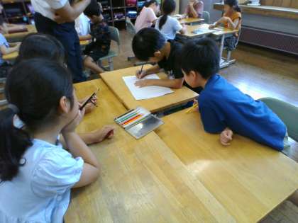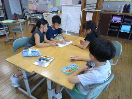 今日は席替えをしました。新しい班のみんなと簡単な図形を組み合わせて絵を描きました。班のみんなと声をかけたり、出来上がった絵について感想を伝え合ったりしていました。