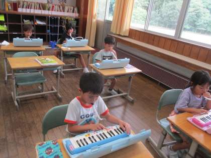 「高い音や低い音が出たよ」「ふたつ一緒に鍵盤を押すと、ふしぎな音が出たよ」など、鍵盤ハーモニカの音色を楽しみました。
