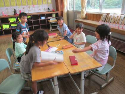 1学期は普通のしりとりを行いましたが、今日は「書き言葉でのしりとり」を行いました。グループで、ワークシートに一人ずつ言葉を書き込み、時間内にどれだけたくさんの単語をつなぐことができるか、に挑戦しました。