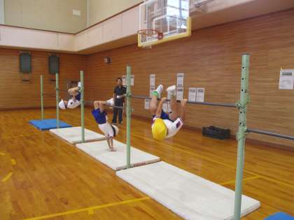 体育科の学習では、鉄棒遊びの学習が始まりました。跳び上がりの技やぶら下がりの技に挑戦しています。
