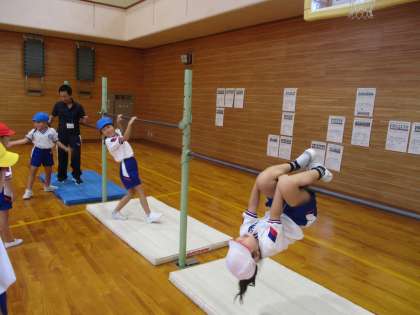 技の掲示を見て、今までやったことのない技に取り組む子供や、友達の技を見て「どうやってやったか教えて」と子供同士で教え合う子供など、「やってみたい」「できるようになりたい」という思いをもって、進んで活動に取り組んでいました。