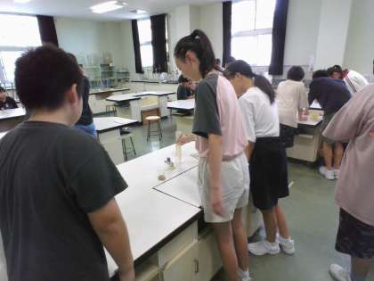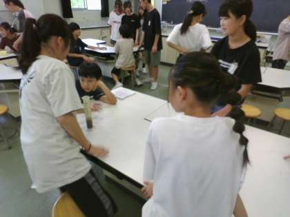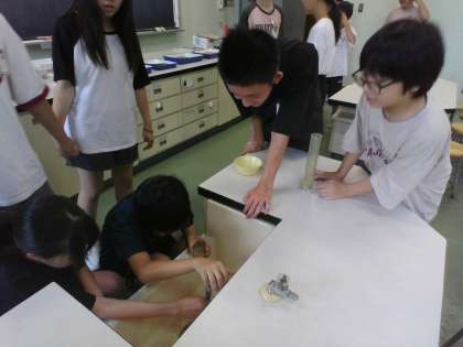 グラウンドの砂や畑の土を使って、地層のでき方を調べました。粒の大きさによって層が積み重なっていくことを実験を通して学びました。