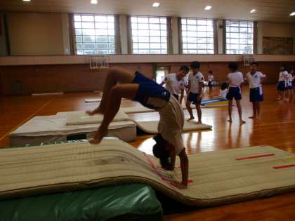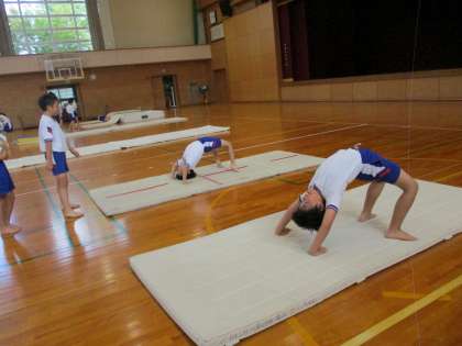 体育科の授業では、鉄棒だけではなくマット運動にも取り組んでいます。