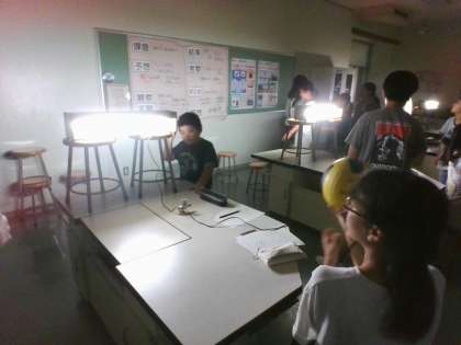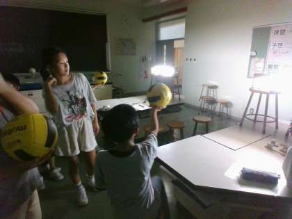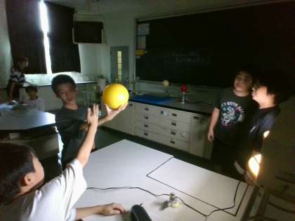 5時間目に光源とボールを使って、月の形が変わって見える仕組みを調べました。ボールと光のあたり具合の変化を感じていました。