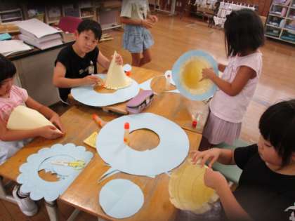 図画工作科の「わっかでへんしん」の学習では、帽子を作りました。帽子やつばの形を決めると、型を切り取って立体にしていきました。とんがり帽子やコックのような帽子等、いろいろな種類の帽子ができました。