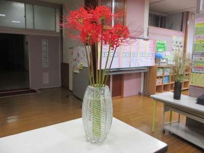 まだまだ暑い日が続いています。先日「いつもならお彼岸の時期に、たくさん咲く彼岸花が、今年は暑さのせいでなかなか咲いていないね」と、子供たちと話していました。すると今朝、「家の庭に咲いたよ」と彼岸花を持ってきてくれた子供がいました。秋は着実にやって来ているのですね。そして、そう言ってお花を持ってきてくれることが、本当にうれしいものです!