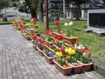 八尾小学校の玄関前のお花も、カラフルでとてもきれいです。
