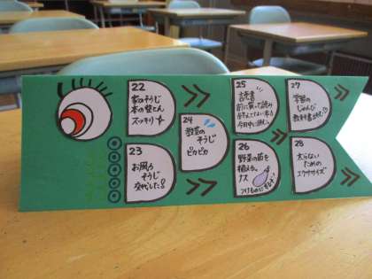 前回の課題の中に入れた「こいのぼり」、先生たちもつくってみました。みんなが作った「こいのぼり」を見るのが楽しみです。