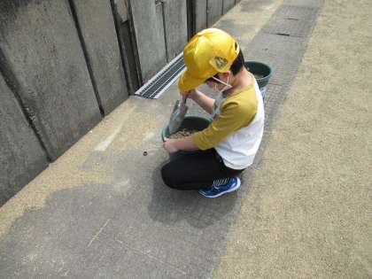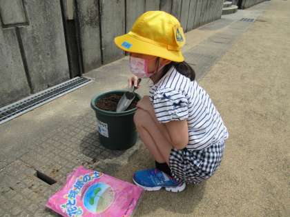 土をやわらかくしたり、えいようのある土を入れたりして、なえをうえました。