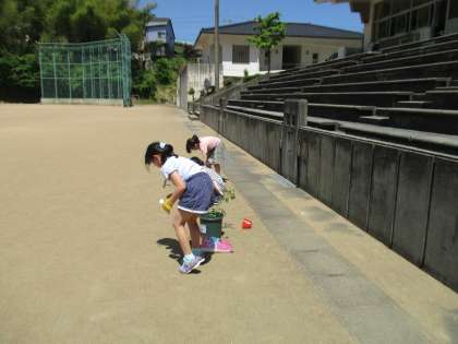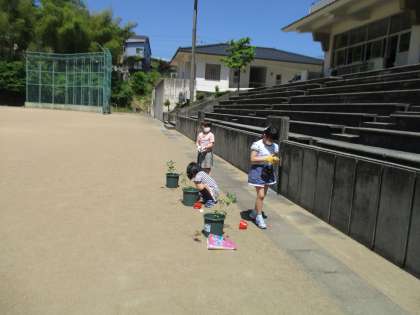 「どうやって苗をカップから出すの?」「ハサミムシが出てきた!」など、活動中にいろいろな声が聞こえる楽しい活動になりました。これからどんなお世話をしていけばいいのか、みんなで調べたり考えたりして、取り組んでいきましょう。