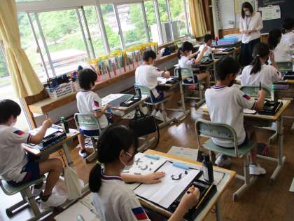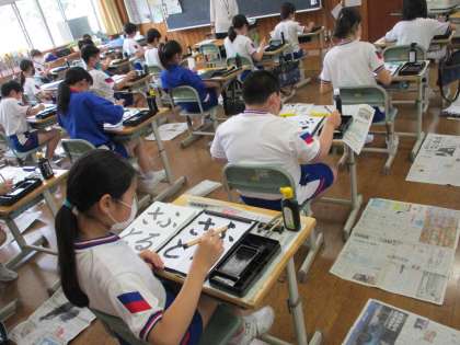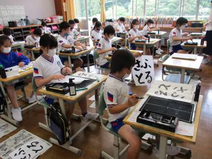 習字の時間、子供たちが真剣に取り組んでいました。限られた教室のスペースの中、間隔を開けて子供たちはのびのびと字を書いていました。