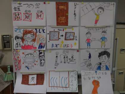 分散登校のある日、お隣のクラスから、仲間に向けたビデオレターをつくる声が聞こえてきました。その楽しそうな雰囲気に、「私たちもつくろう!」「でも真似をするのははかっこ悪い…」と議論になり、「コロナ対策ソング」をつくってビデオレターにすることになりました。「夢をかなえてドラえもん」の替え歌の歌詞をみんなで考え、ポスターをつくり、リハーサル、そして本番!。時間が足りなくて考えることができなかったサビの部分は、翌日登校してきた仲間に委ねることになりました。