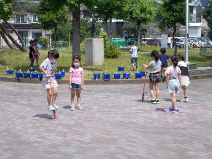 今日はホッピングに挑戦する子供がいました。距離を取って、順番を守って、仲良く遊べましたね!もちろん休み時間が終わったら、きれいに手を洗いました。