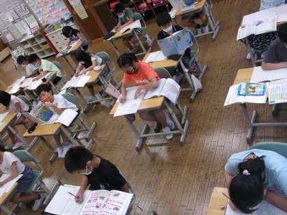4年生では、国語科と社会科を関連させ、「カンジ—はかせの都道府県の旅」の学習を始めました。仲間に各都道府県の特徴を分かりやすく伝えることを目当てに、調べ活動を行います。約束は、都道府県名は漢字で書くことと、事実に基づいていることです。