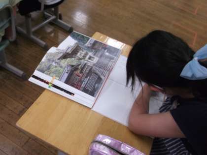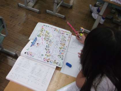子供たちは、家から持ってきたパンフレットや都道府県パズル、地図帳、図書室で借りた本等を用いて、真剣に調べていました。