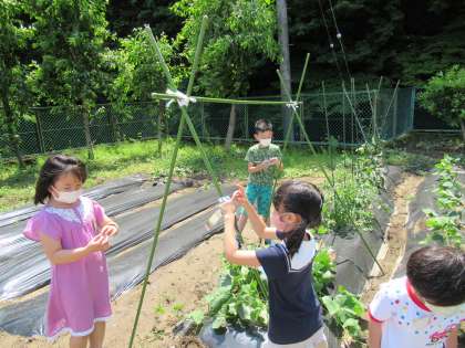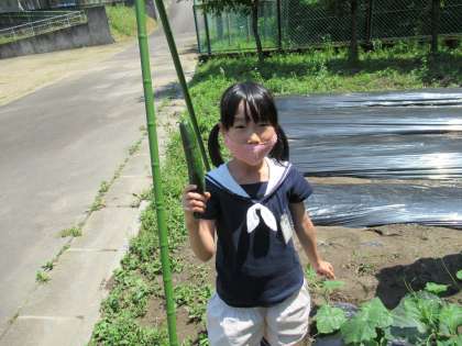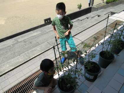 数日降り続いた雨も上がり、自分たちが調べてきた野菜の育て方を実践しようと、さっそく休み時間に観察や世話をしていました。
