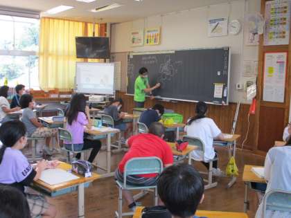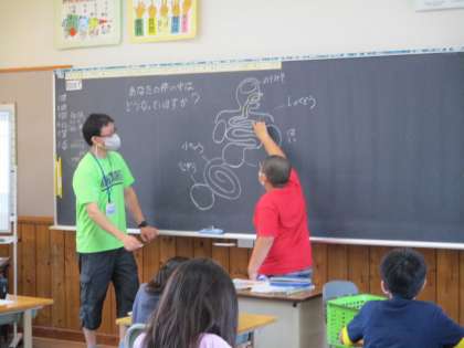 一人一人が知識を使って体の中を絵に表した後、黒板で確認していました。